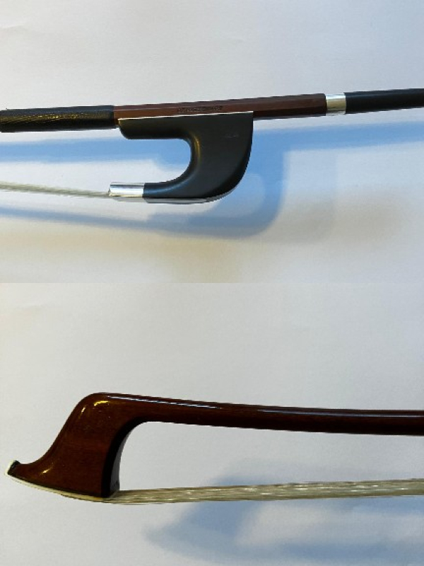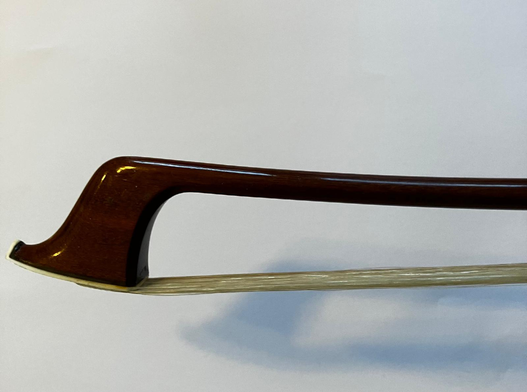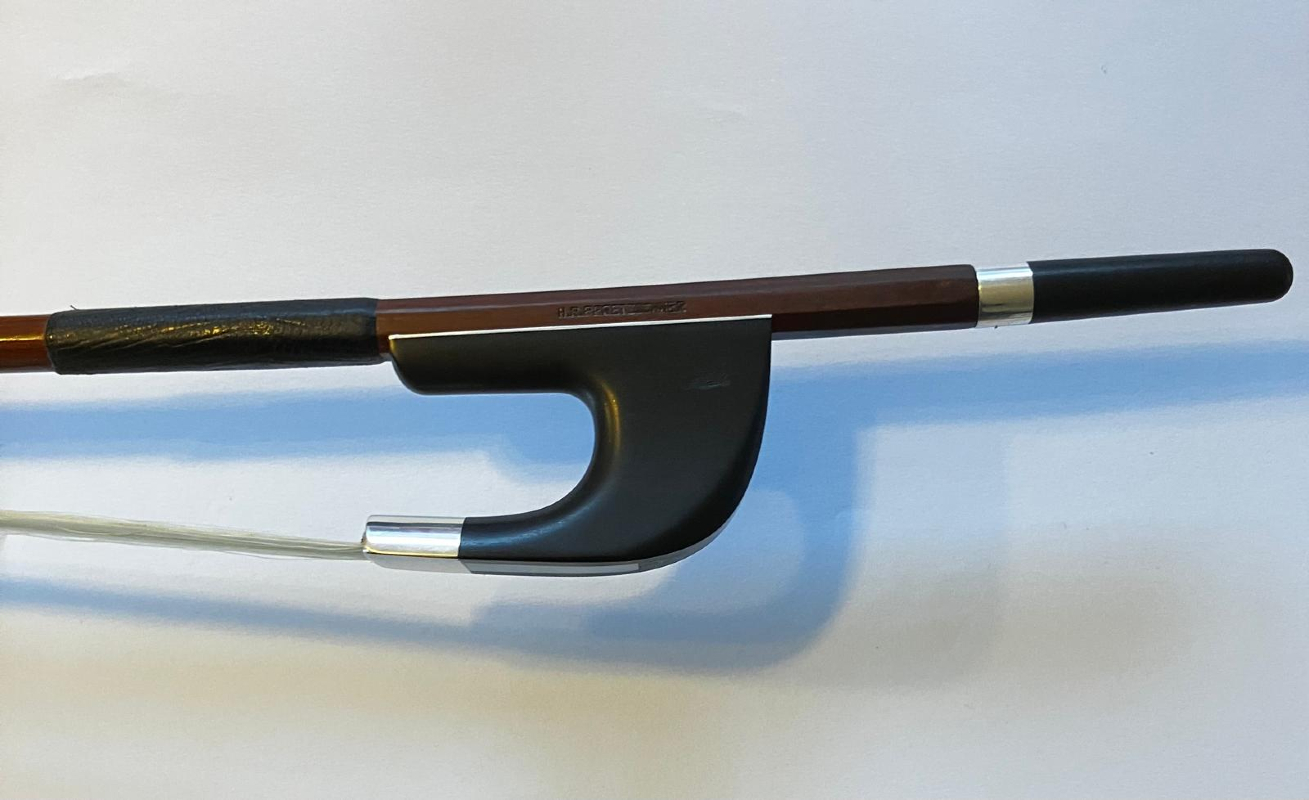 Ein sehr schöner H.R. Pfretzschner Kontrabassbogen mit Silbergarnitur. Er hat eine eckige Stange aus Fernambuk, einen deutschen Frosch, ein Daumenleder aus Schlangenhaut, die Kopfplatte ist aus Elfenbein und der Schub ist aus Perlmut.